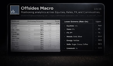 Offsides Macro is a positioning-based framework derived from integrated futures and options positioning data across global markets, built to measure that gap. It tracks not just who holds risk, but how vulnerable those holders are to funding stress and how quickly flows can become self-reinforcing once price starts to move.